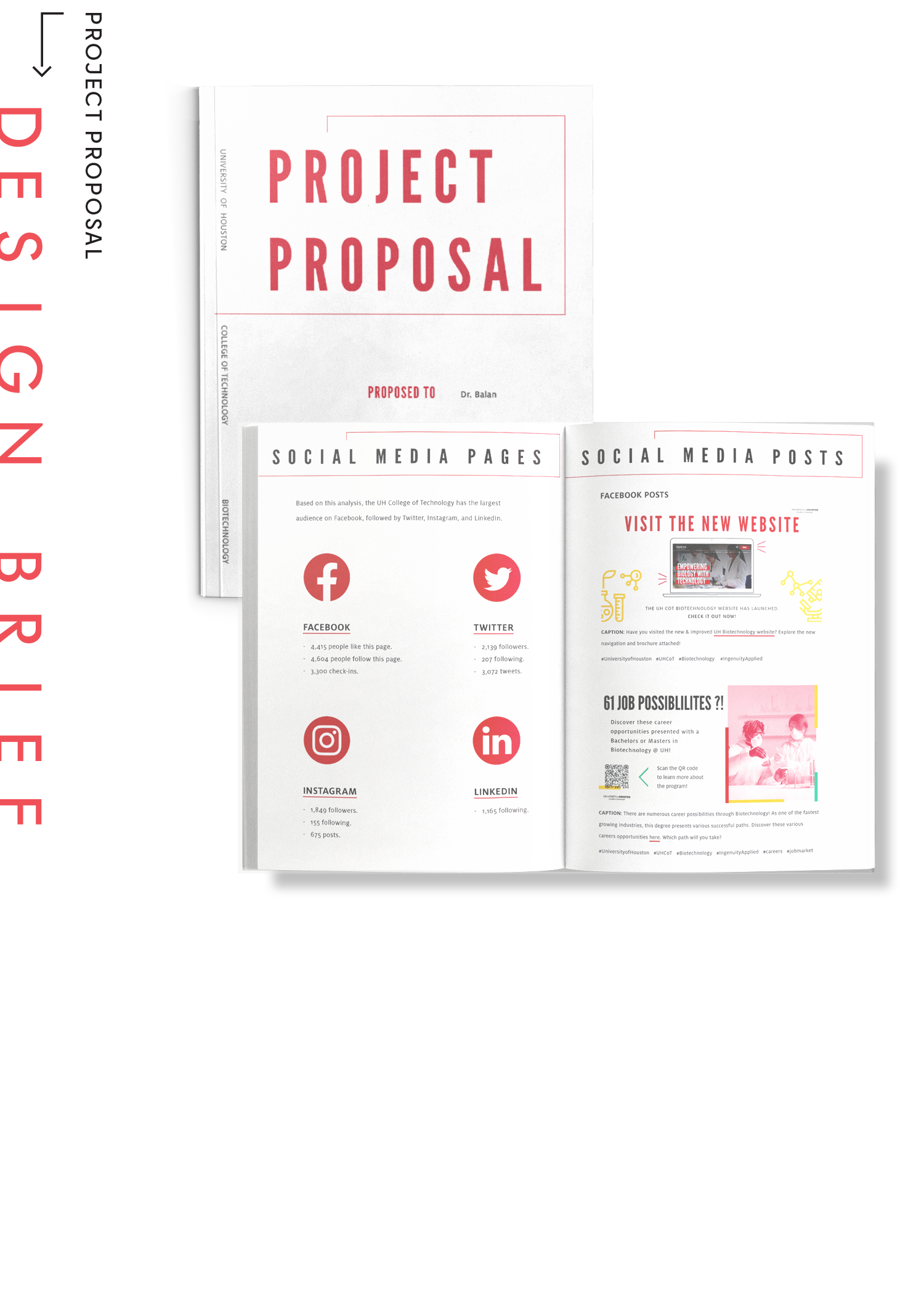My team members and I created a project proposal for our client, the Program Coordinator of the Biotechnology Program at the University of Houston. Our client requested a website wireframe, a 6-page brochure, various social media posts, and video production ideas. My team decided to complete different project deliverables based on our strengths. I was in charge of the client research, target audience research, social media posts, video production ideas, and the final proposal document. First, I conducted the research on the target audience by reviewing statistics on the National Center for Education, as well as reviewing other program competitors’ websites and social media accounts. Based on this research, I created social media posts to highlight the key differentiation between the Biotech program at UH, in comparison to other universities. These social media posts were aimed at the target market and included brief information, such as the course schedule, Biotech club, as well as job possibilities and starting salary. Once our project deliverables were completed, I compiled the files and arranged them in the final project proposal. Our client was pleased because my team exceeded his expectations by providing various key features and materials to guide this UH program.